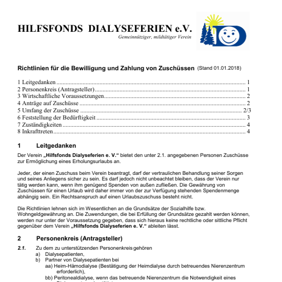 Der Antragsteller muss seit mindestens sechs Monaten Mitglied in einem Verein sein, welcher Mitglied im Hilfsfonds Dialyseferien e.V. ist und der dem BN e.V. (Bundesverband Niere e.V.) angehört. Außerdem besteht Zuschussberechtigung nur für Personen mit ständigem Wohnsitz in Deutschland. Die Bedürftigkeit muss nachgewiesen werden.
