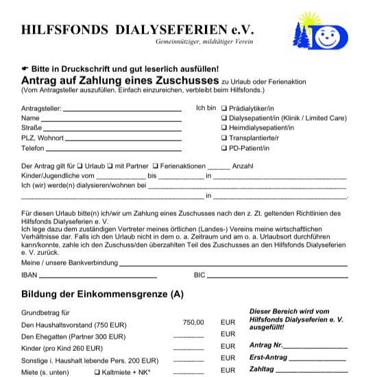 Ein Antrag ist so rechtzeitig zu stellen, dass er nach durchgeführter Prüfung durch die Vorsitzenden (Beauftragten) der örtlichen Vereine dem Hilfsfonds Dialyseferien e.V. vier Wochen vor Urlaubsantritt vorliegt. Ausnahmen von dieser Frist müssen schriftlich begründet werden.